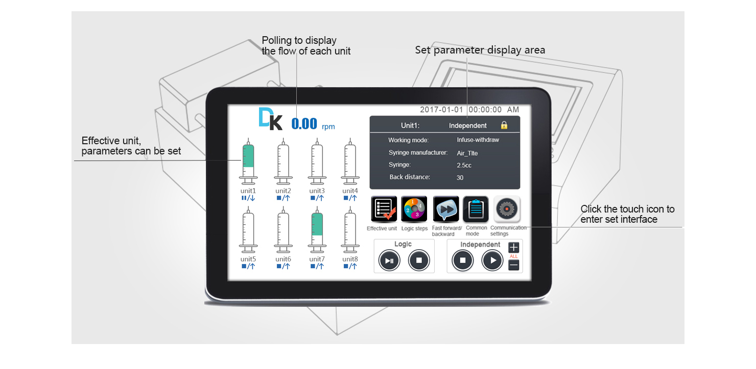 • Two working modes: Independent working mode, each unit working independently, can infuse or withdraw with different speed in same time or different time. Logic working mode, each unit working with time relationship, with different proportion infuse or withdraw. Users can choose each unit to be independent or logic working mode.